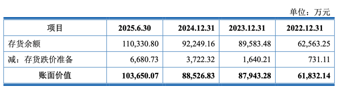 其存货规模出现明显上升趋势,并在2025年6月末突破10亿元大关,存货占流动资产的比例分别为48.13%、61.95%、58.45%及63.42%,占比较高。