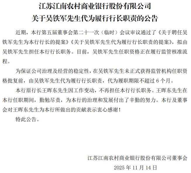 2025年11月下旬,江南农商行公告了一项高管人事变动,经董事会决议,吴铁军被聘任为新任行长,其任职资格已进入监管审批流程。在获批前,他将以代行长身份履职,代职期最长6个月。
