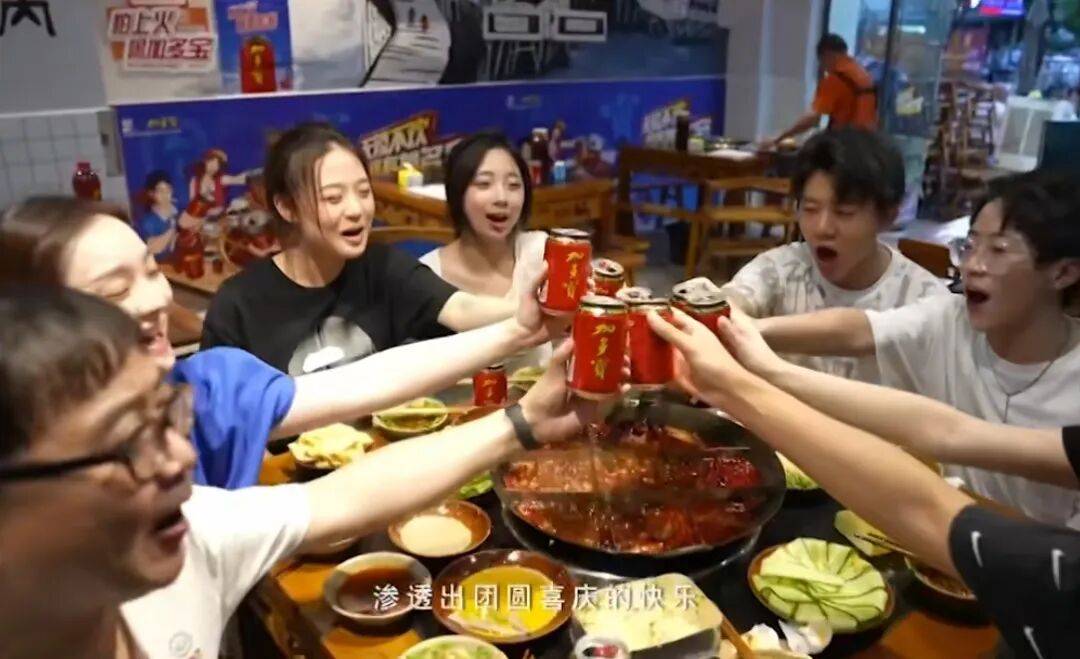 比如,在一则主打“吃火锅就喝加多宝”的广告中,画面里热油翻滚、红油冒泡,一群年轻人围坐大笑,手边整齐摆着冰镇红罐。搭配“辣到冒烟?一罐加多宝,火气秒退散”的文案,坚持怕上火的经典定位,还将主角从家庭聚餐换成了Z世代社交。