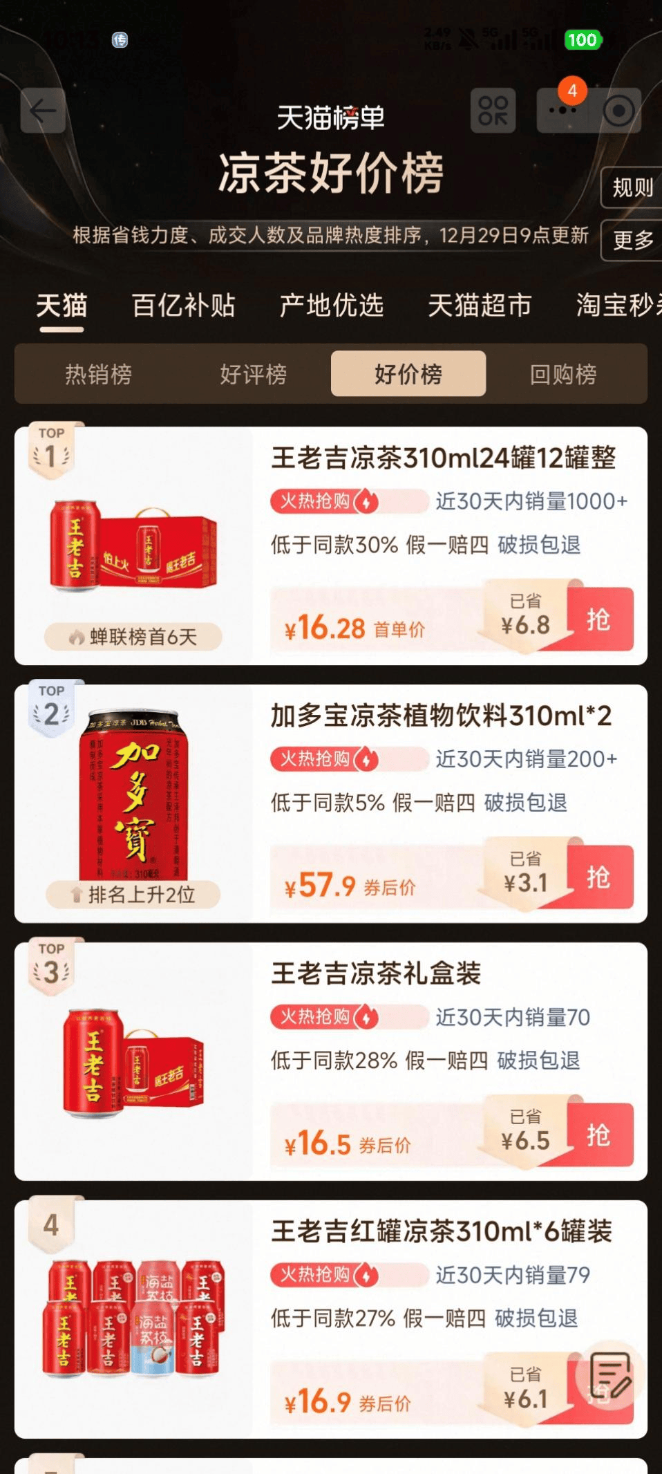 而曾经与王老吉并驾齐驱的加多宝,却在这三大关键榜单上全面缺席——唯独在好价榜(即促销力度最大、折扣最深的商品榜单)中,才出现其身影。
