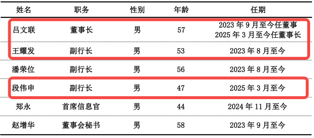 直至2025年末,该行以董事长吕文联作为“掌舵人”,形成了“一正四副”的行长格局。王耀发已“由副转正”,副行长层面新增马睿、陈青龙,此外董秘已由赵增华变更为胡云泉。