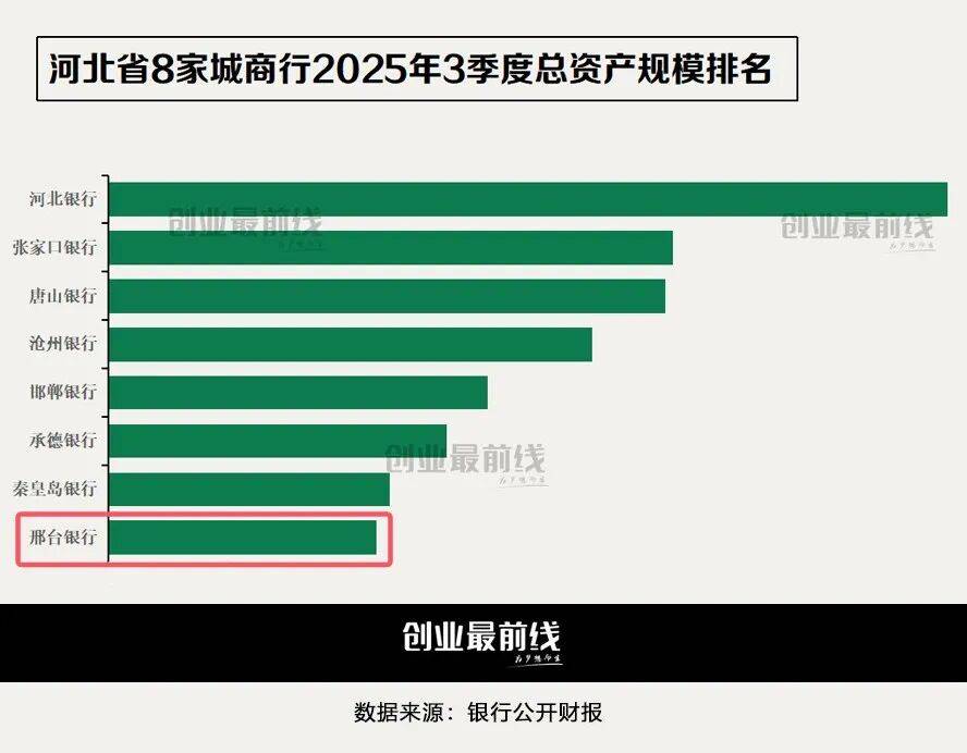 截至2025年三季度末,据不完全统计,河北省8家城商行披露了总资产规模。其中,前三名分别是河北银行5737.05亿元、张家口银行3861.36亿元、唐山银行3810.67亿元。然而,邢台银行仅达到1831.66亿元,排在第八名。
