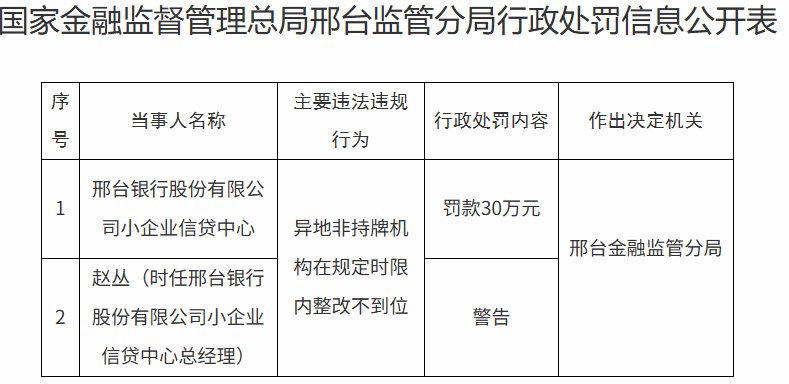 第三,邢台银行小企业信贷中心异地非持牌机构在规定时限内整改不到位,被罚30万元。该信贷中心总经理赵丛被处以警告处罚。