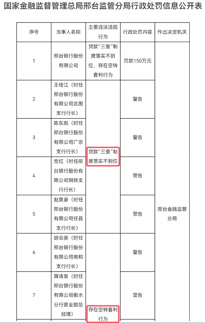 第一,贷款“三查”制度落实不到位、存在空转套利行为,被罚150万元。这项罚单被处罚的人员最多,共有7名支行行长收到警告处罚。