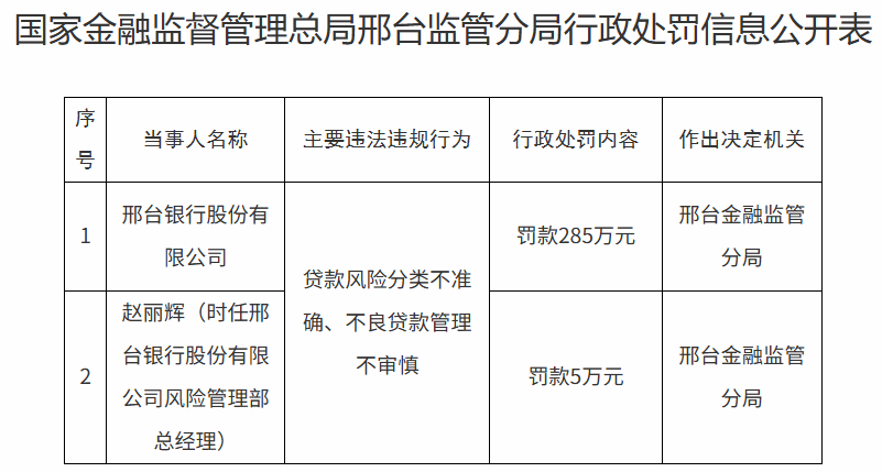 第二,贷款风险分类不准确、不良贷款管理不审慎,被罚款285万元。同时,该行总行风险管理部总经理赵丽辉被罚5万元。