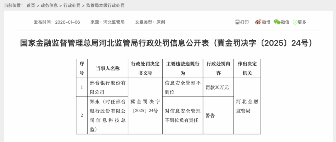 2026年1月6日,国家金融监督管理总局河北监管局官网披露了一则行政处罚信息公开表,显示邢台银行因信息安全管理不到位,被罚款30万元。
