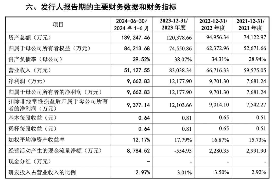 据招股书显示,从2021年到2024年上半年,该公司的营业收入分别为5.958亿元、6.672亿元、8.304亿元和5.113亿元,归属母公司股东的净利润分别为7681.24万元、9701.3万元、12177.9万元和9662.83万元。