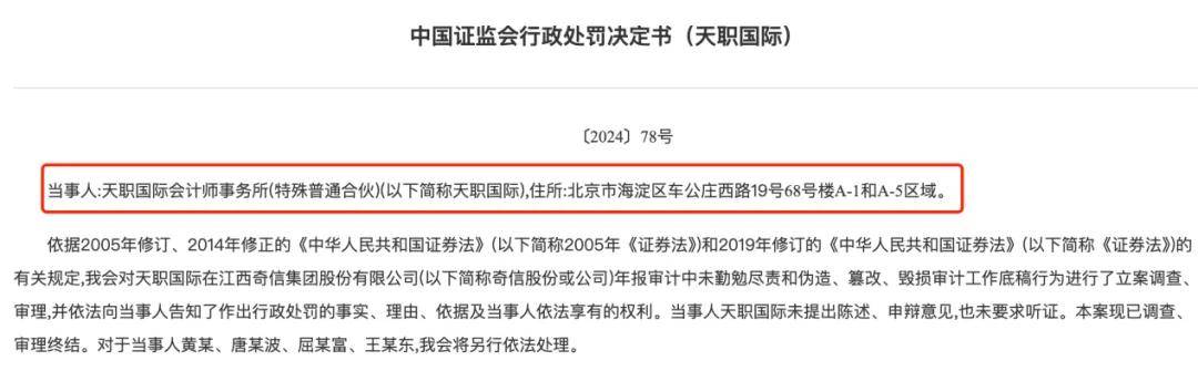 今年8月,证监会发布公告显示,天职国际在奇信股份年报审计中未勤勉尽责,制作、出具的审计报告存在虚假记载。此外,天职国际还伪造、篡改、毁损审计工作底稿。