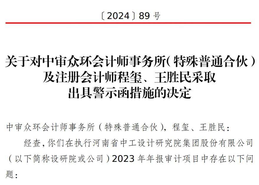 此外,11月15日,中审众环因在执行河南省中工设计研究院集团股份有限公司2023年年报审计项目中,存在营业收入审计程序不到位、营业成本审计程序不到位等问题,中审众环及签字注册会计师程玺、王胜民被河南证监局采取出具警示函的行政监管措施,并记入证券期货市场诚信档案。