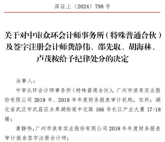 9月26日,深交所发布公告称,中审众环因广州浪奇2018年、2019年年度审计报告存在虚假记载以及在审计过程中未勤勉尽责,被深交所给予公开谴责的处分。