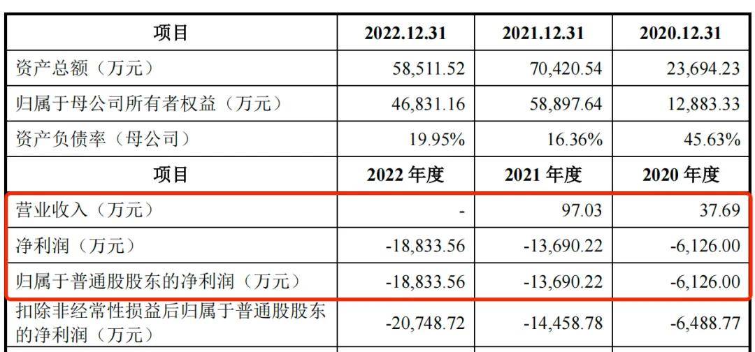 招股书显示,2020年-2022年(以下简称“报告期”),必贝特的营业收入分别为37.69万元、97.03万元和0;归母净利润分别亏损6126万元、1.37亿元和1.88亿元。三年间必贝特累计营业收入刚过百万,但归母净利润却已经亏损3.86亿元。