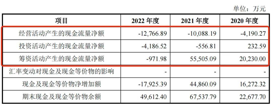 报告期内,必贝特的筹资现金流净额分别为2.02亿元、5.55亿元和-971.98万元。在2022年时,筹资现金流净额也转为流出状态。