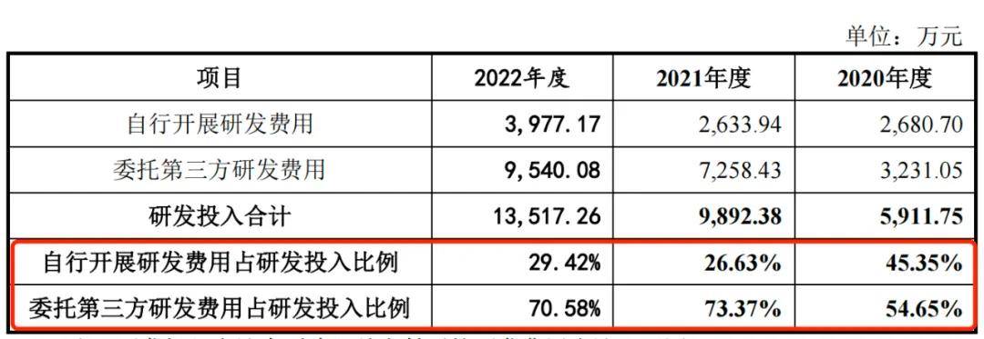 其中,公司自行开展研发费用占研发投入的比例分别为45.35%、26.63%和29.42%;委托第三方研发费用占研发投入比例为54.65%、73.37%和70.58%。