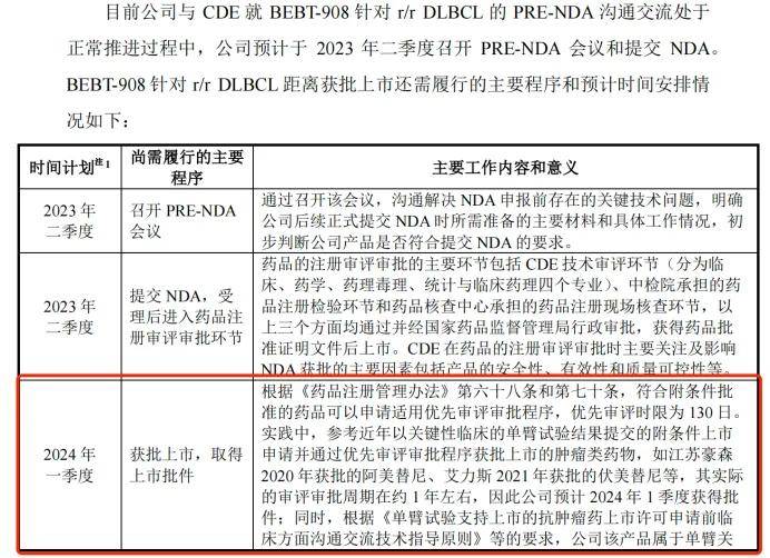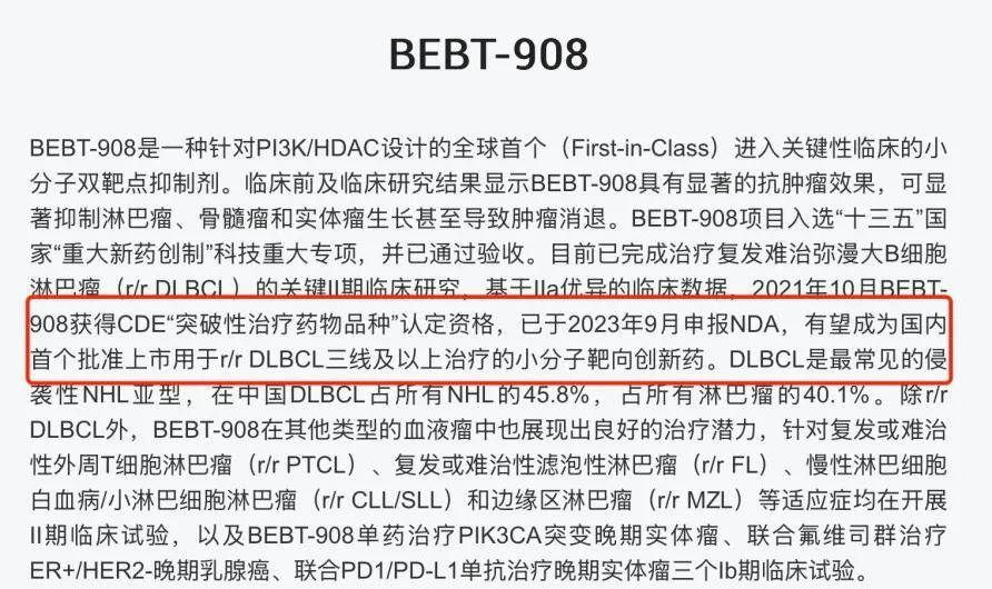 招股书显示,BEBT-908是必贝特重要的核心产品,首个推进的适应症为治疗复发或难治性弥漫大B细胞淋巴瘤(r/r DLBCL)。该产品于2021年1月获得中国CDE同意以II期单臂关键性临床试验结果申请附条件上市,并在2022年12月提交PRE-NDA会议申请。