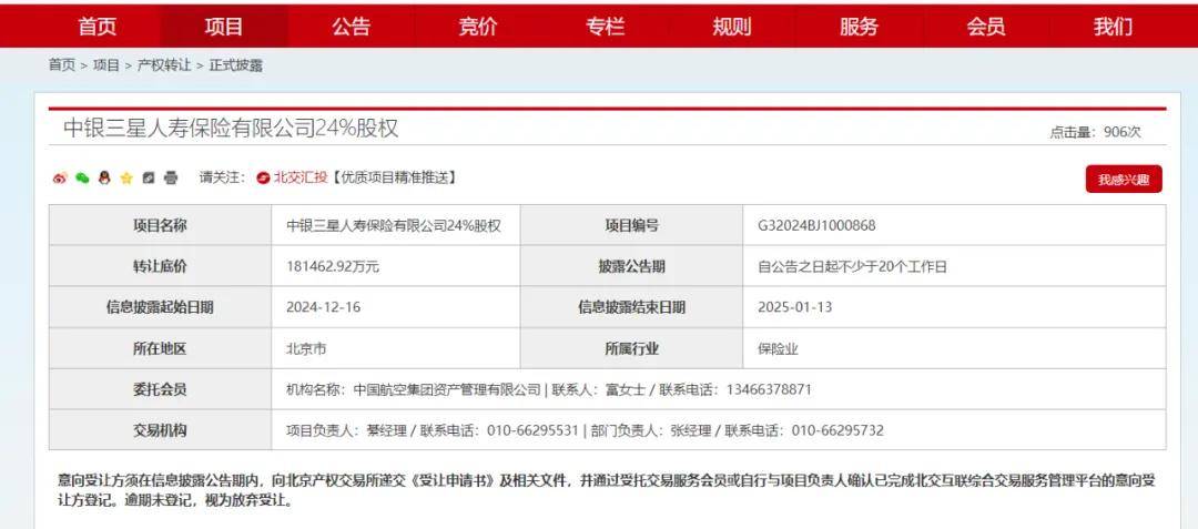 12月16日,中航集团于北京产权交易所,以18.15亿元挂牌转让所持中银三星人寿24%股权。价款支付方式为一次性支付,保证金金额约5.44亿元,信息披露起止日期为2024年12月16日至2025年1月13日。