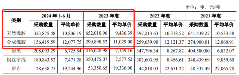 招股书披露,2024年上半年,中策橡胶采购天然橡胶的平均单价在1.08万元/吨,合成橡胶的平均单价在1.21万元/吨,均较2023年出现增长。