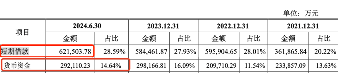 截至2024年6月30日,中策橡胶的短期借款高达62.15亿元,而货币资金仅有29.21亿元,难以覆盖短期借款。