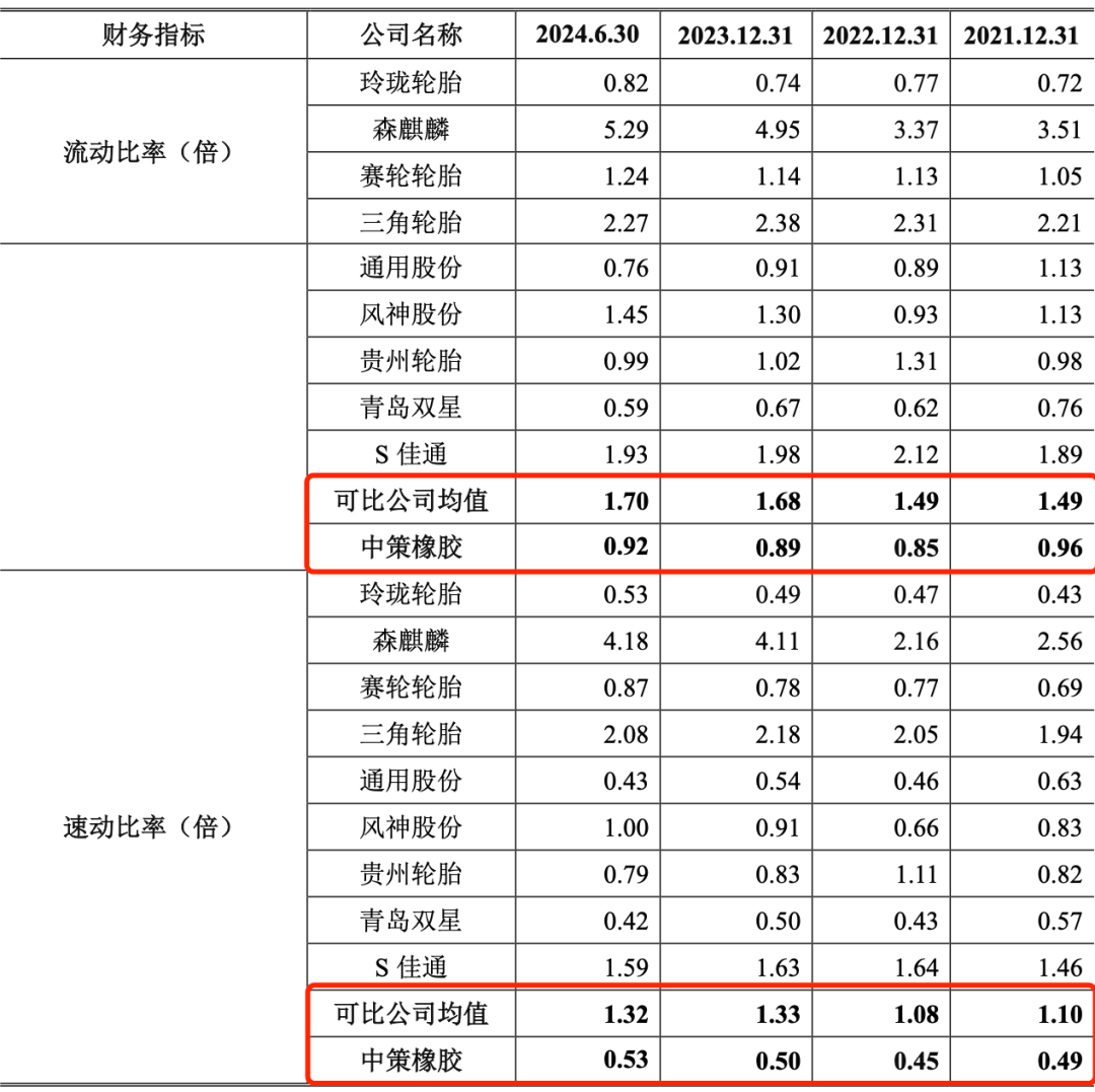 放在行业中来看,也可窥得中策橡胶面临的压力。招股书显示,中策橡胶的流动比率分别为0.96倍、0.85倍、0.89倍和0.92倍,速动比率分别为0.49倍、0.45倍、0.50倍和0.53倍,均低于同行可比公司均值。