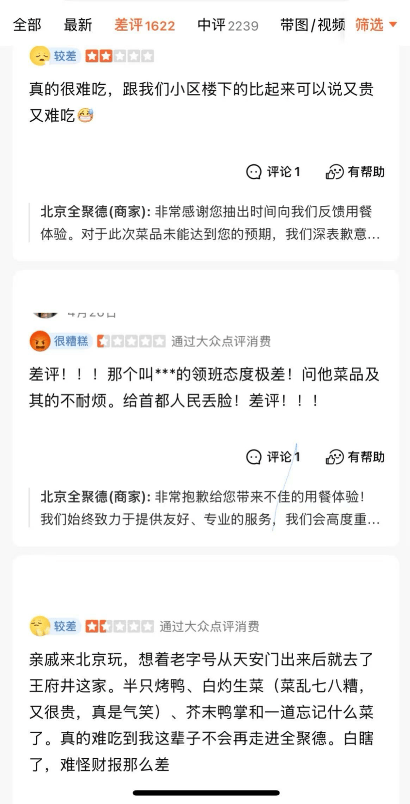 在大众点评平台上,一家位于北京的全聚德直营店差评达到1600余条,吐槽该门店价格高、环境一般、上菜慢、难吃、菜量少等。