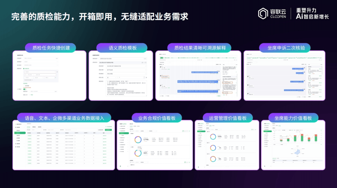 容联云对AI技术的深刻理解,最终要通过产品形态触达企业需求。基于大小模型协同架构与数据飞轮机制,其推出的QM Agent(智能质检)、Agent Copilot(坐席辅助)、Insight Agent(会话洞察)等系列产品,精准切入金融等高合规行业的痛点场景,实现了从技术能力到业务价值的转化。这些产品不仅是技术的载体,更是AI新质生产力在产业端的具体呈现。