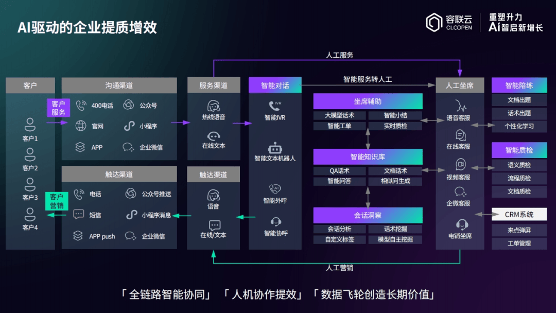 在容联云看来,AI新质生产力的本质是“底层能力的代际升级”,而底层能力不再是孤立的技术模块,而是形成了“模型迭代-数据沉淀-算法优化”的有机循环。