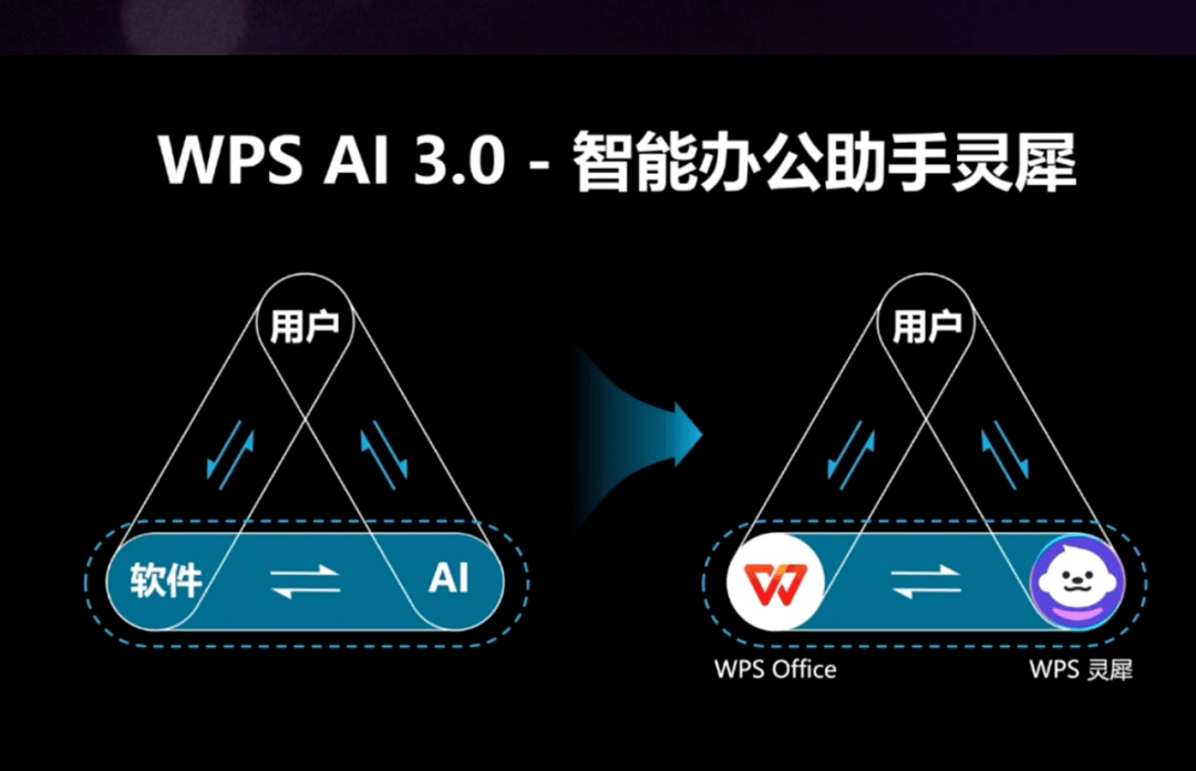 WPS AI 3.0彻底改变了人机交互模式,从过去“人躲在AI背后发号施令”的线性逻辑,转变为“用户-办公软件-AI”三方协同的三角形逻辑。用户不再是单纯地向AI下达指令,而是与AI肩并肩操作办公软件,通过多轮对话的方式共同完成工作任务。