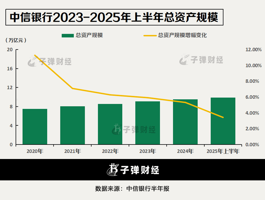 然而,该行总资产规模的增速却持续下滑,从2020年的11.27%直线回落至2025年上半年的3.42%。
