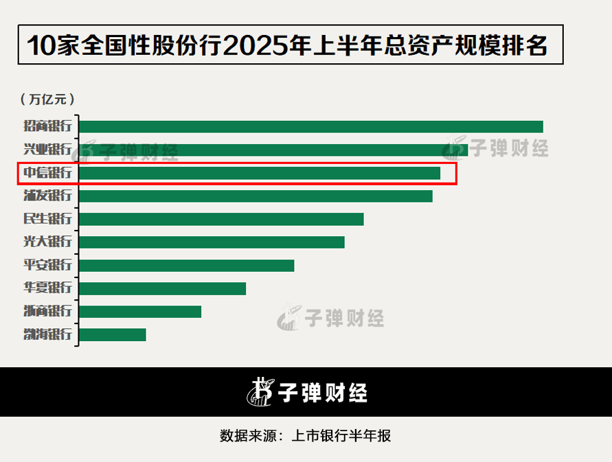 「子弹财经」发现,通过横向同业对比来看,中信银行的总资产规模在10家已上市的全国性股份行之中,排名位列第三,仅次于招商银行12.66万亿、兴业银行10.61万亿。