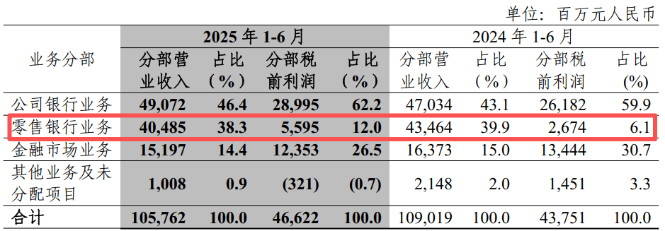 半年报显示,该行零售银行业务分部营收404.85亿元,占比38.3%,但相较于2024年同期的434.64亿元,呈现下滑态势。