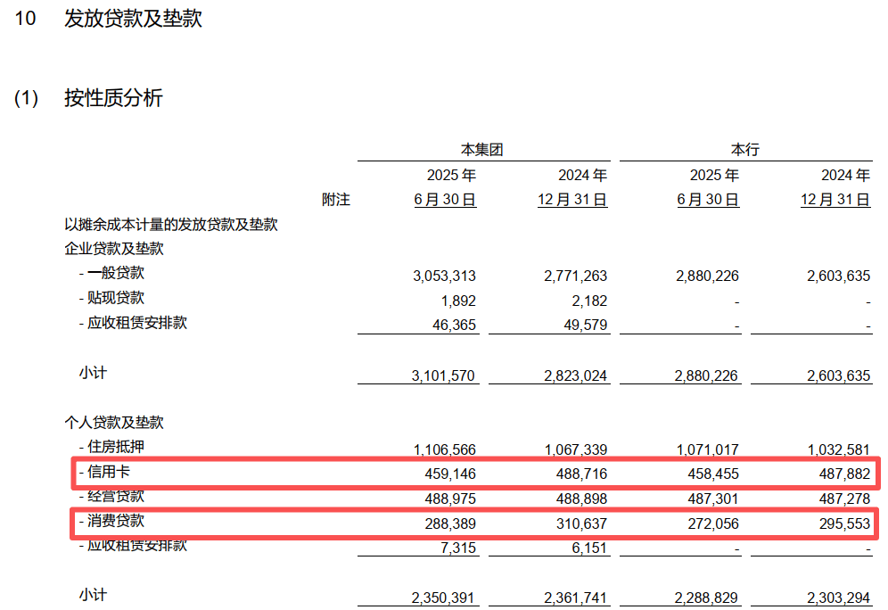一方面,在零售信贷领域,该行上半年在消费贷款和信用卡贷款两项业务上,规模均出现回落。其中,消费贷款余额2720.56亿元,同比下滑7.88%。