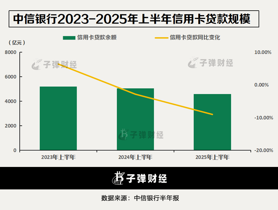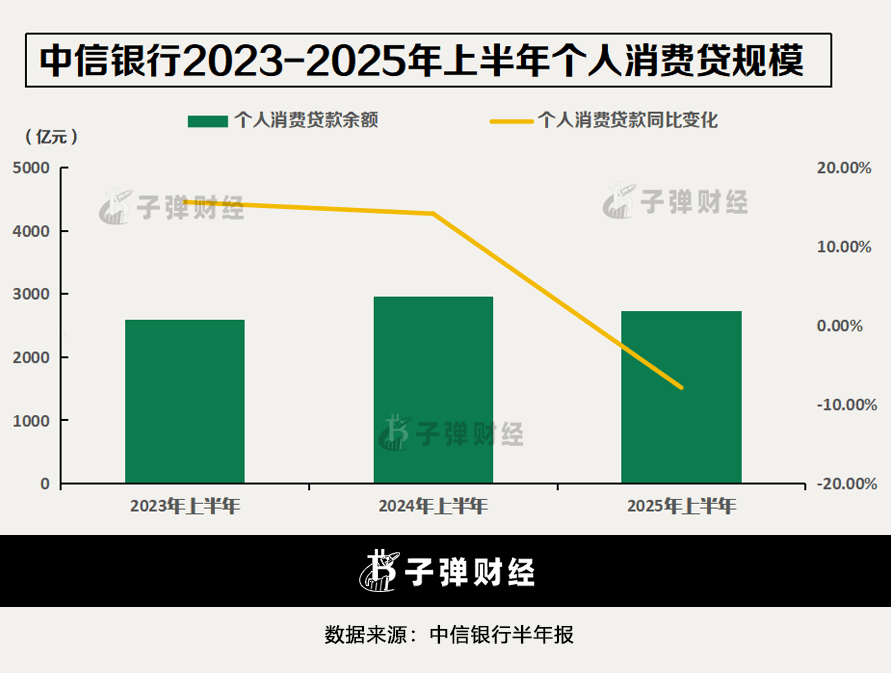「子弹财经」选取了2023年至2025年上半年的经营数据,发现中信银行近三年的消费贷款同比增速分别为15.62%、14.15%和-7.88%。