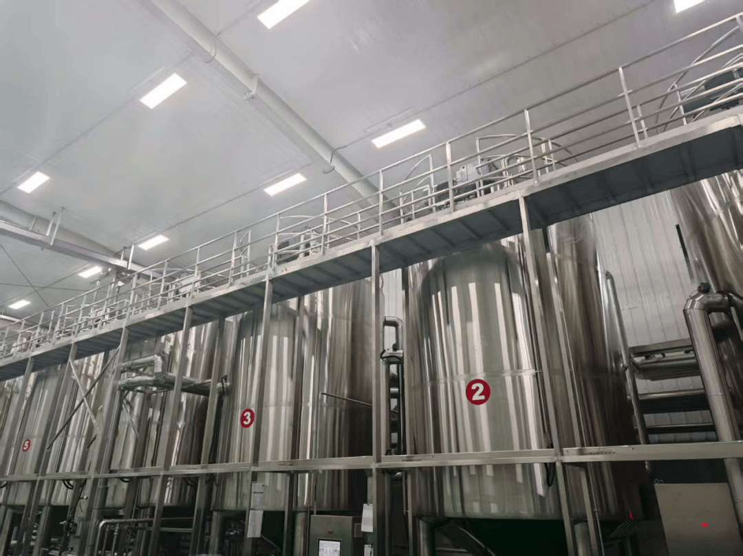 杀菌后的原料通过管道运送到发酵车间,这里排列着六个22吨医疗级不锈钢发酵罐。经过杀菌后的原料在这里与农科院专家定向驯化的菌株混合,开启为期7天的发酵之旅。