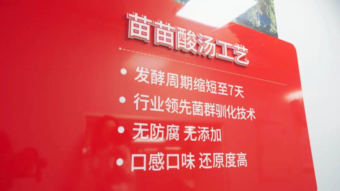 苗苗酸汤食品的工作人员向「子弹财经」透露,在制作酸汤的“原料-精选-清洗-破碎-混合-杀菌-发酵-炒制-灌装”全链条中,每一步都有相应标准。且科研团队为了风味,还设计了阶梯控温与动态监测工艺,实现发酵过程可视可控,使风味稳定性提升了12倍。