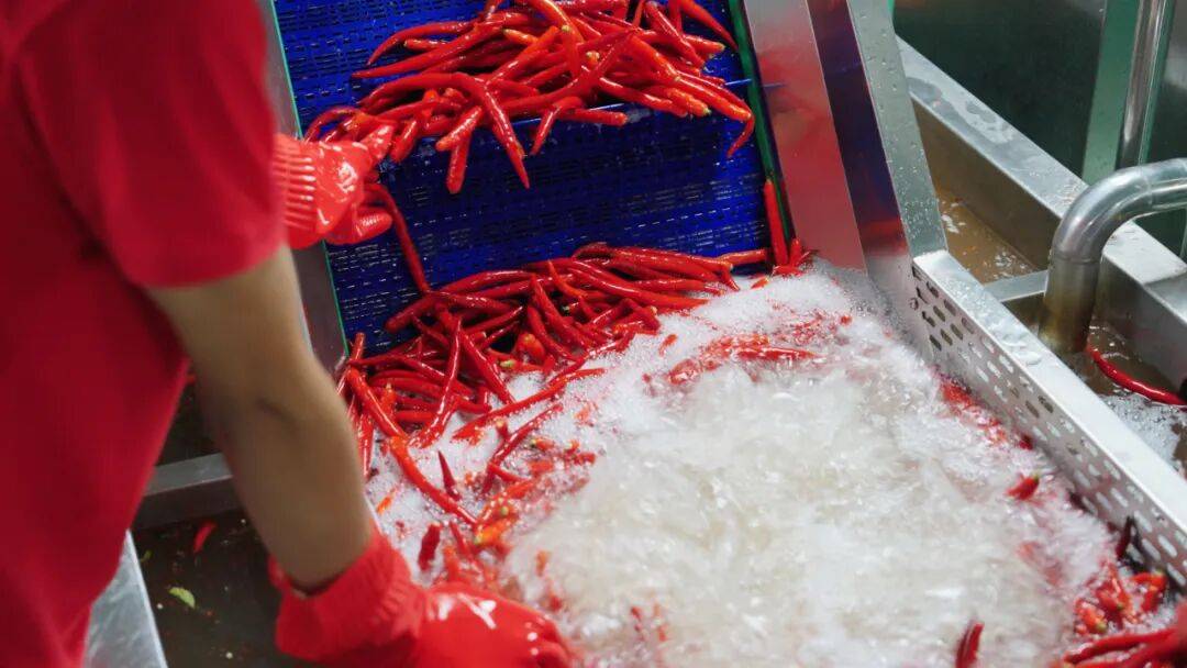 筛选后的原料进入清洗环节。在调配杀菌车间,工人将打包好的新鲜辣椒、毛辣果以及生姜等原料进行清洗,去除表面的泥土、杂质和农药残留。清洗后的原料通过流水线进行切片、粉碎处理,使其更易于后续的发酵。
