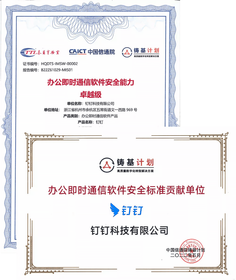 早在2022年,中国信通院“铸基计划”的安全评估中,钉钉就从首批参评产品里脱颖而出,拿下最高安全级别的“卓越级”认证。