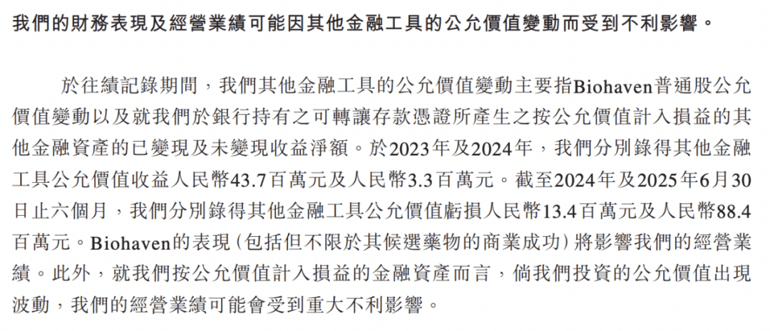 2024年及2025年上半年,Biohaven的股价下行分别对其他金融工具的公允价值变动造成了1340万元和8840万元的亏损。
