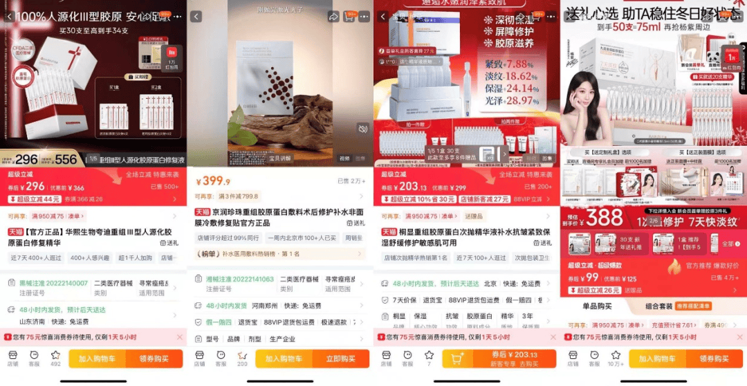 以可复美王牌产品重组胶原次抛精华为例,目前市场上同类产品的供应正在膨胀,供应者除了可复美外,还有老牌美妆品牌丸美、夸迪,新兴品牌敷益清、桐显,甚至包括跨界者京润珍珠。