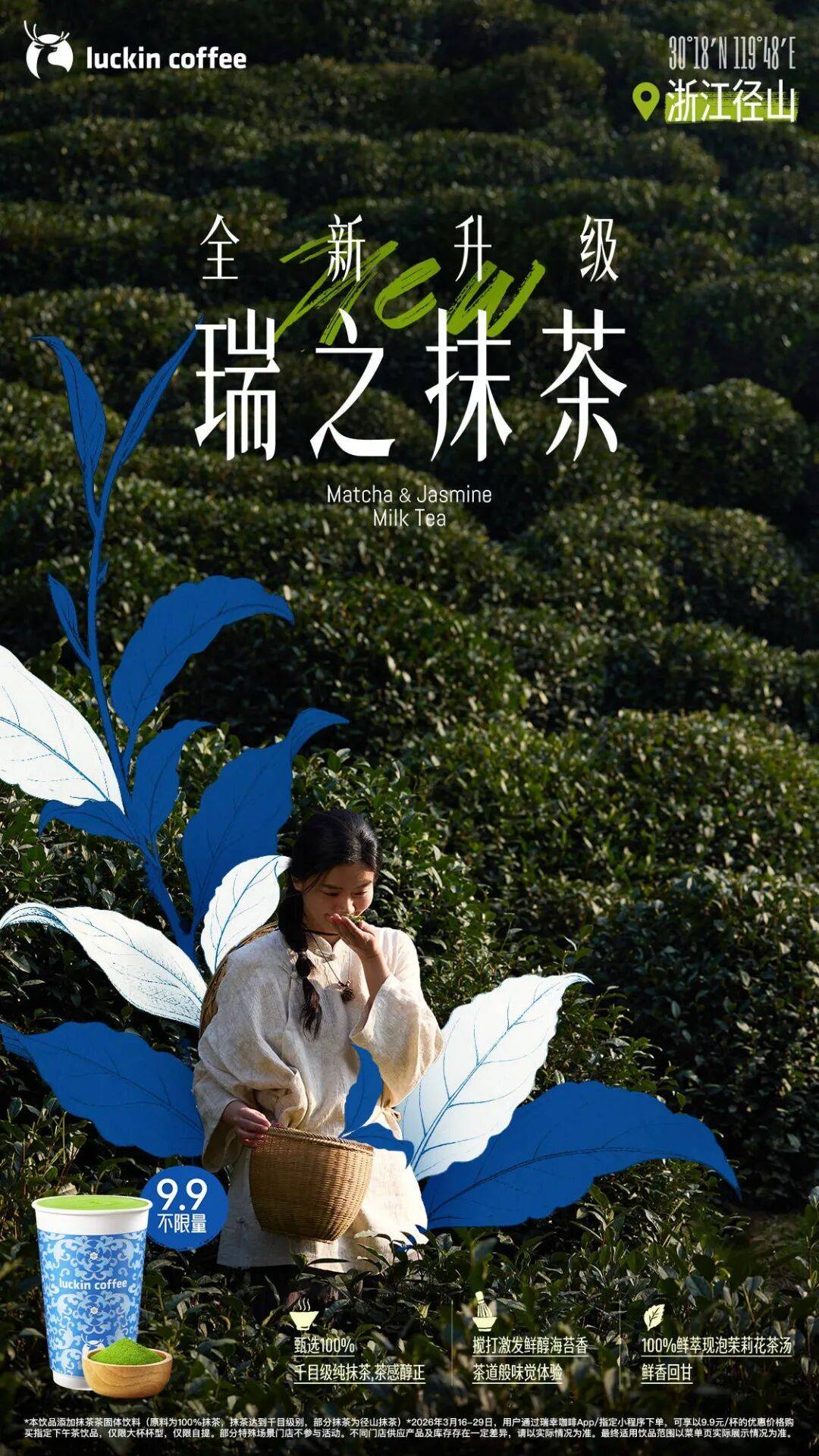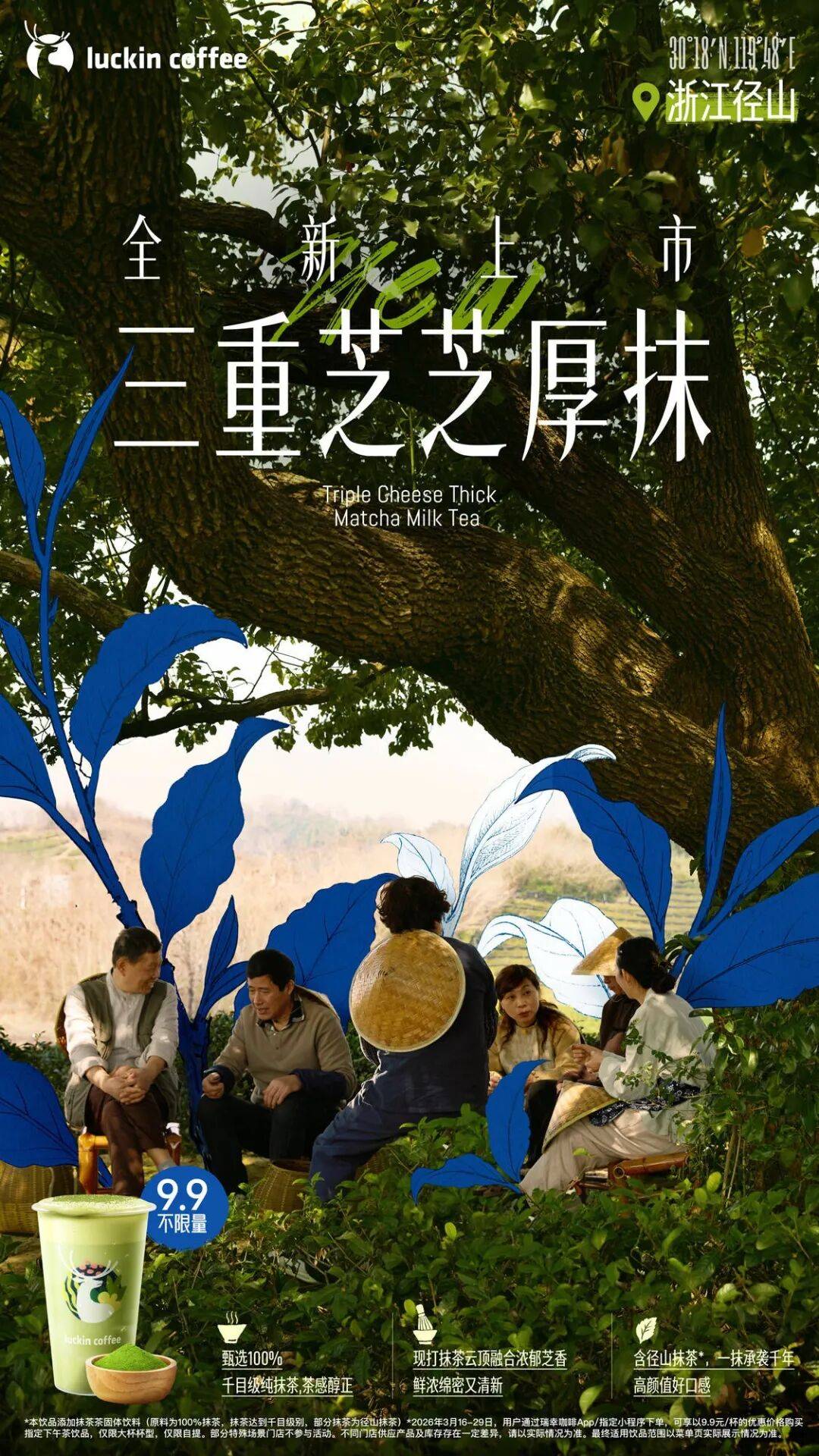 如今,这种局面可能迎来了改观,在抹茶赛道一直默默耕耘的瑞幸,在3月迎来了一波重磅产品更新:推出抹茶风味新品“三重芝芝厚抹”,将“瑞之抹茶”“抹茶丝绒拿铁”等抹茶集体进行产品升级,并正式官宣了在杭州径山成立专属抹茶原产地,搭配「原产地·鲜活季」重启了标志性的“9块9”活动,且大促时长长达两周。