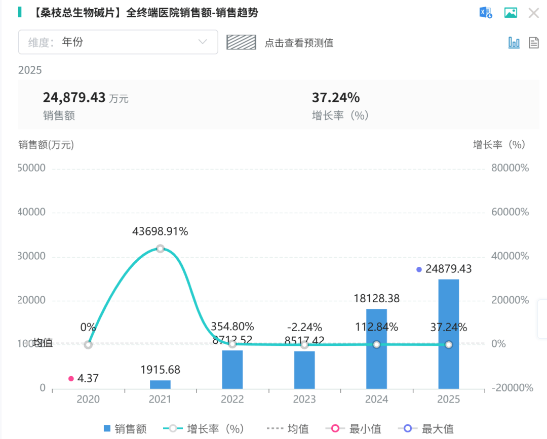 从市场表现来看,桑博恩自上市以来逐步打开市场。摩熵·医药数据库显示,凭借“天然”这一差异化优势,桑博恩的全终端医院销售额已从2021年的1915万元增长至2025年的2.5亿元。