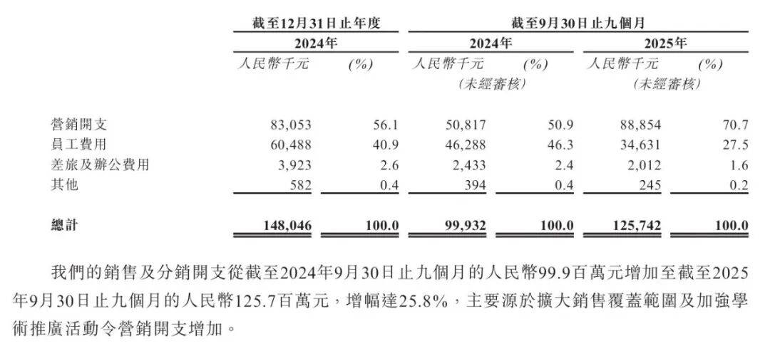招股书显示,公司销售费用率长期维持在较高水平,主要用于员工费用以及市场推广、医生教育、患者认知建设等。2024年、2025年前三季度,公司的销售费用分别为1.48亿元、1.26亿元,占营收的比例高达71%、61%。