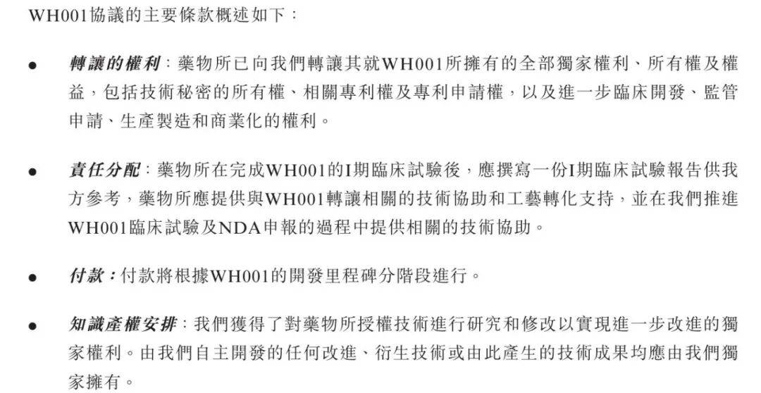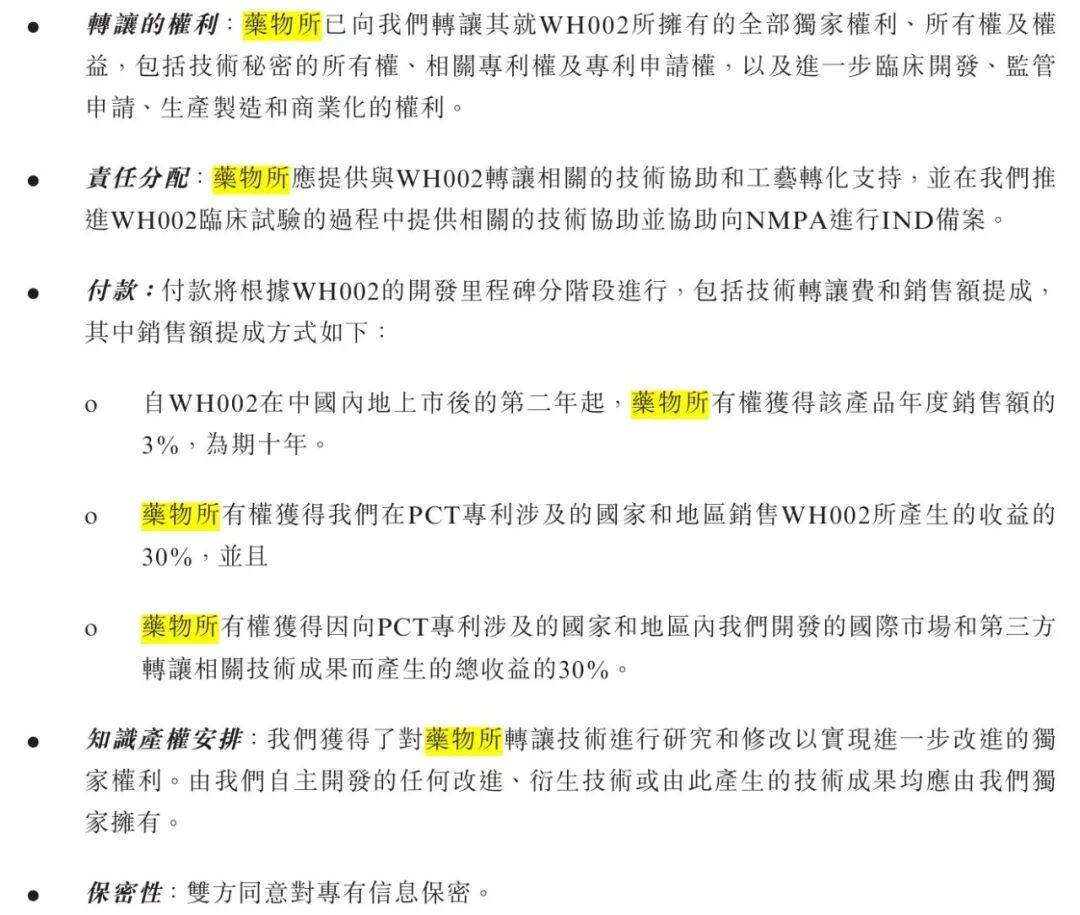 2012年,公司从药物所受让WH002(抗肿瘤靶向紫杉醇脂质乳剂候选药物,适应症为乳腺癌术前新辅助治疗)的全部独家专利及后续开发、生产、商业化权利。若成功上市,药物所将获得中国内地销售额3%(为期10年)的收益分成。