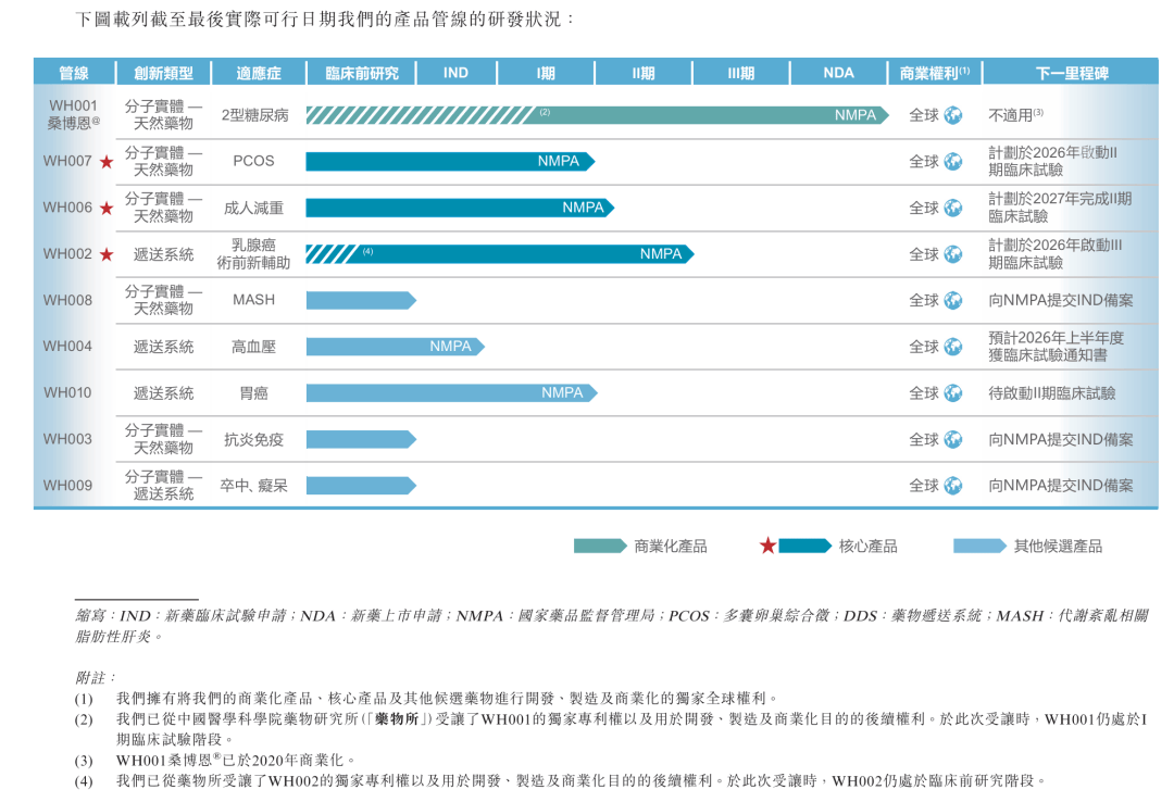 公司管线中的WH006(肥胖症)和WH007(多囊卵巢综合征)均延续了以SZ-A为原料的“天然药物”核心定位,目前均处于国内II期临床阶段前后。