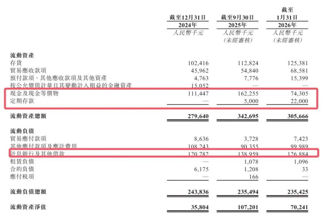 截至2026年1月31日,公司的现金及现金等价物余额仅剩7430.5万元,另有2200万元定期存款,合计不足1亿元,难以覆盖高达1.27亿元的短期银行及其他借款。