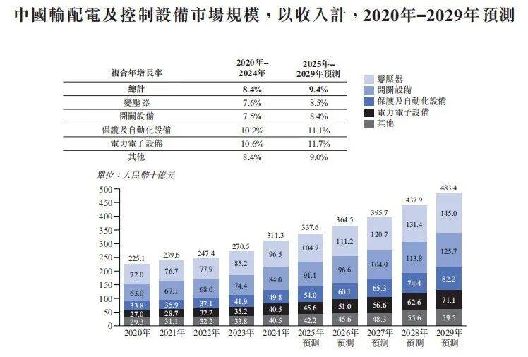根据弗若斯特沙利文预测,2029年中国输配电控制设备市场规模将进一步增长至4834亿元,2025年至2029年年复合增长率将达到9.4%。