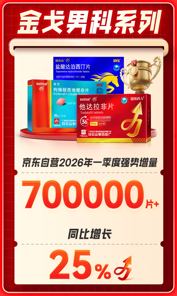行业数据显示,2025年上半年,京东和美团两大电商平台上,金戈的销售总额已超过3.8亿元。进入2026年,金戈在电商渠道的增长势头依然强劲。数据显示,2026年第一季度,金戈男科系列产品在京东自营的销量较去年同期增加高达70万片,同比增长达25%,线上渠道正持续成为品牌增长的“第二曲线”。