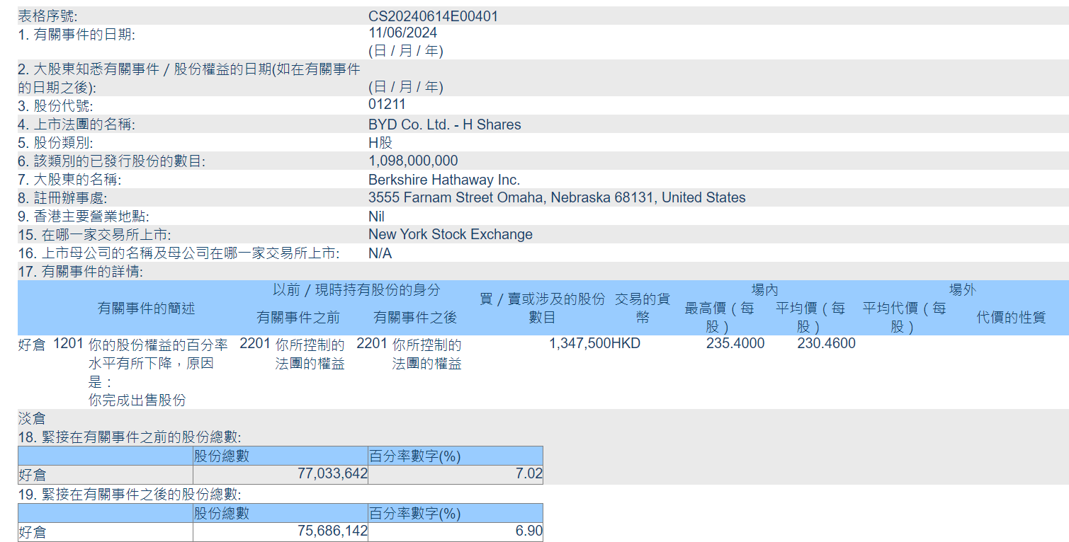 本次减持后,伯克希尔·哈撒韦还持有7,568.61万股比亚迪H股。
