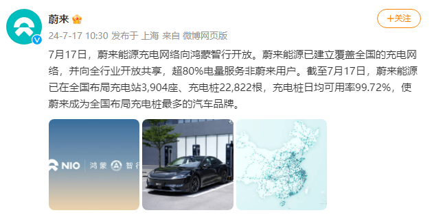 7月17日,蔚来官方发布消息称,蔚来能源和华为鸿蒙智行(HIMA)达成充电服务合作,蔚来能源充电网络将向鸿蒙智行品牌车型(包括AITO问界、LUXEED智界、STELATO享界)开放。