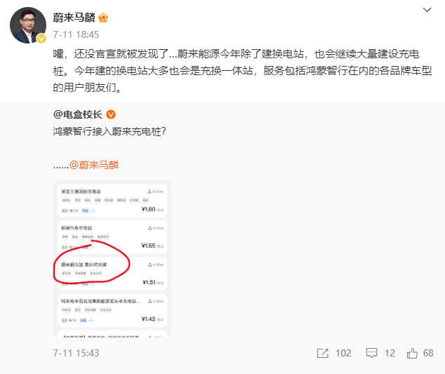 在此之前,蔚来品牌与传播助理副总裁马麟就曾透露:“蔚来能源今年除了建换电站,也会继续大量建设充电桩。今年建的换电站大多也会是充换一体站,服务包括鸿蒙智行在内的各品牌车型的用户朋友们。”