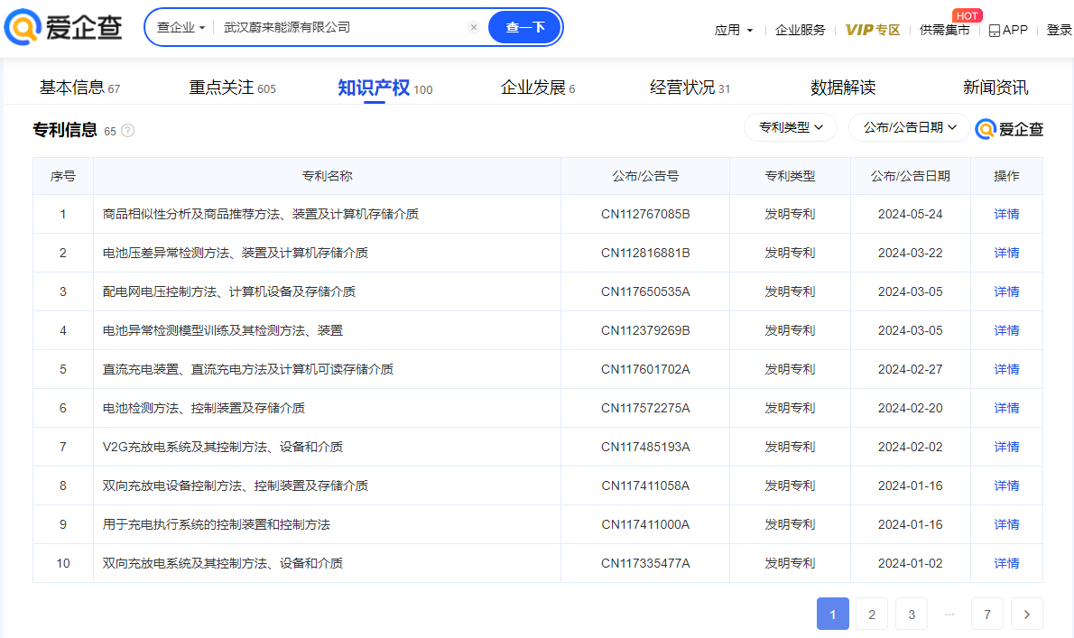 爱企查专利信息显示,蔚来能源已申请65项专利,类型涵盖发明专利、外观设计、实用新型三种,绝大多数为发明专利。其中,充电相关专利有近20项,包括充电桩、充电座、直流充电装置等,大部分已获得授权。