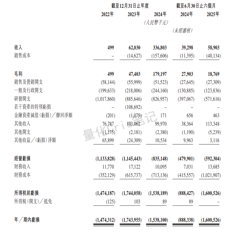 业绩方面,收入和亏损都很夸张。一方面是收入暴涨,从2022年的49.9万元,到2024年的3.37亿元,年复合增速接近“反常识”;另一方面是亏损巨大,2022–2024年累计亏损超过47亿元,如果算到2025年上半年,累计亏损已经超过63亿元,主要原因是研发投入太重,三年砸了约27亿元,而且还没到收割期。